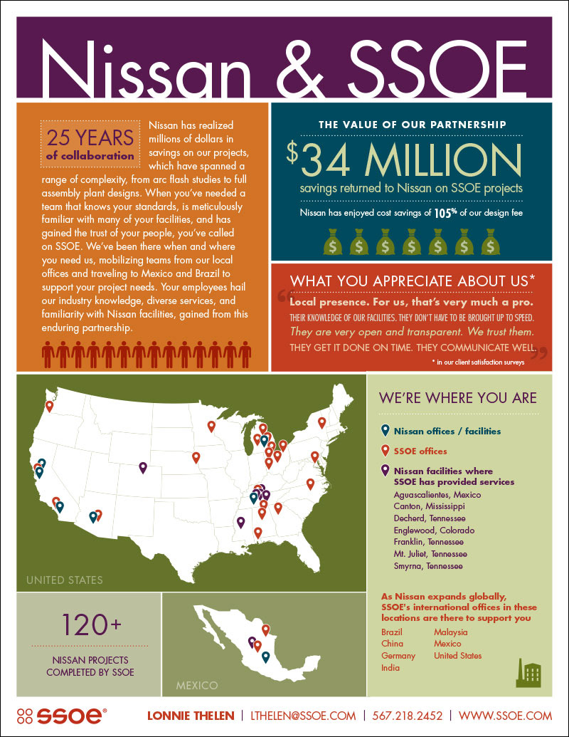 A series of flyers for SSOE highlighted the long-standing relationships they have with their clients. This profile was designed to illustrate SSOE's work for Nissan.